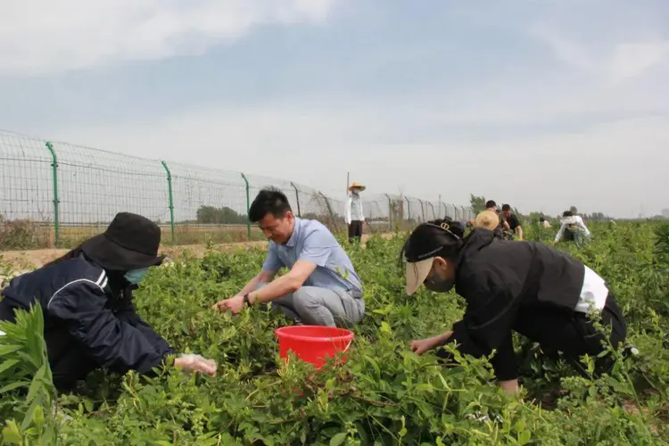 在滨州市中医医院中药种植基地,来自滨州市中医医院的党员志愿者为大家介绍了种植基地的基本情况。基地占地300亩,主要种植中药有金银花、红花、丹参、射干、桔梗、白芷、白芍等道地药材,并对它们的药性特征及临床应用进行了详细介绍。采药是我国中医药界绵延数千年的传统,在基地专业人员的指导下,各位党员志愿者化身采药人,穿梭在田野地间,顶着炎炎烈日,认真采摘丰收的金银花,并在采药的过程中体验丰收的喜悦和采药的艰辛。