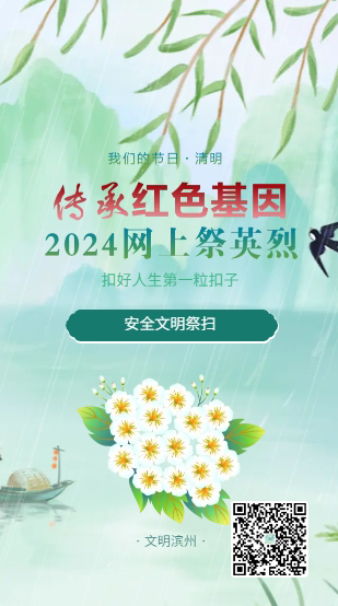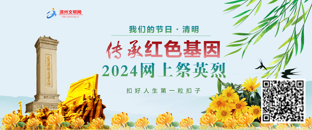 序春草绿,又到清明。为传承弘扬英烈事迹和精神,积极引导广大群众特别是广大未成年人,永远铭记为民族独立、人民解放和国家富强、人民幸福作出巨大贡献和牺牲的英雄烈士,营造传承英烈精神、奋进新时代的良好氛围。滨州市文明办依托滨州文明网,开设“传承红色基因·网上祭英烈”网络专题,号召滨州广大群众积极参加网络祭奠活动,缅怀革命先烈,传承红色基因。