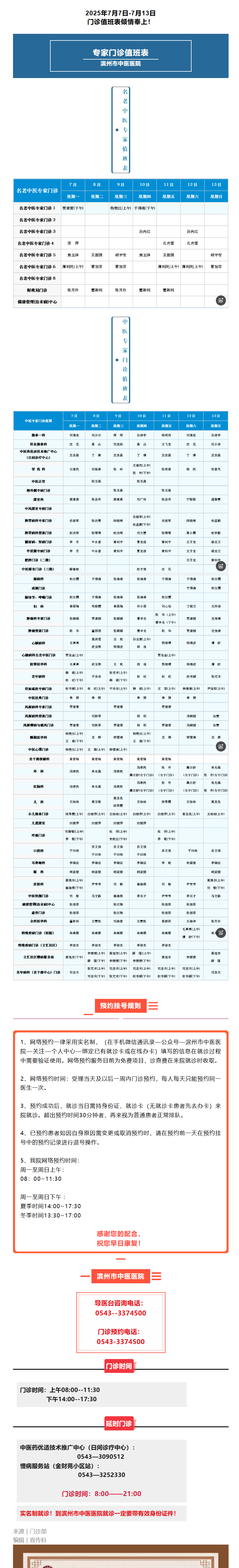 滨州市中医医院(滨州医学院附属中医医院)2025年7月7日-7月13日门诊值班表