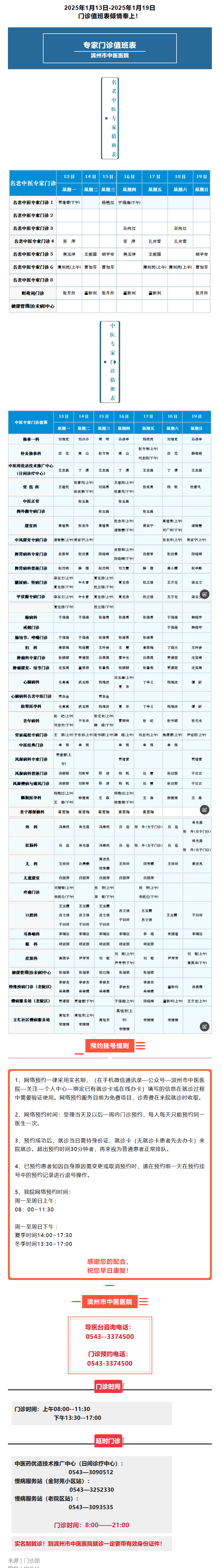 滨州市中医医院(滨州医学院附属中医医院)2025年1月13日-1月19日门诊值班表