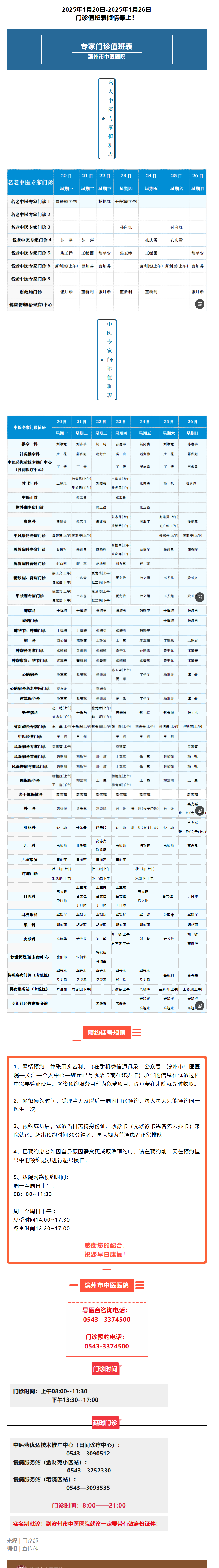 滨州市中医医院(滨州医学院附属中医医院)2025年1月20日-1月26日门诊值班表