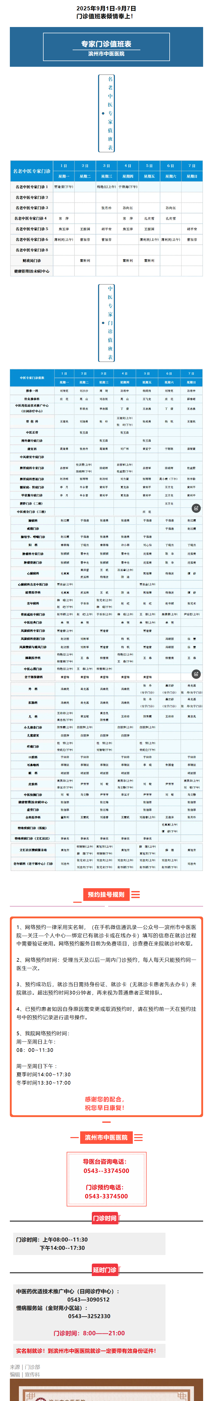滨州市中医医院(滨州医学院附属中医医院)2025年9月1日-9月7日门诊值班表
