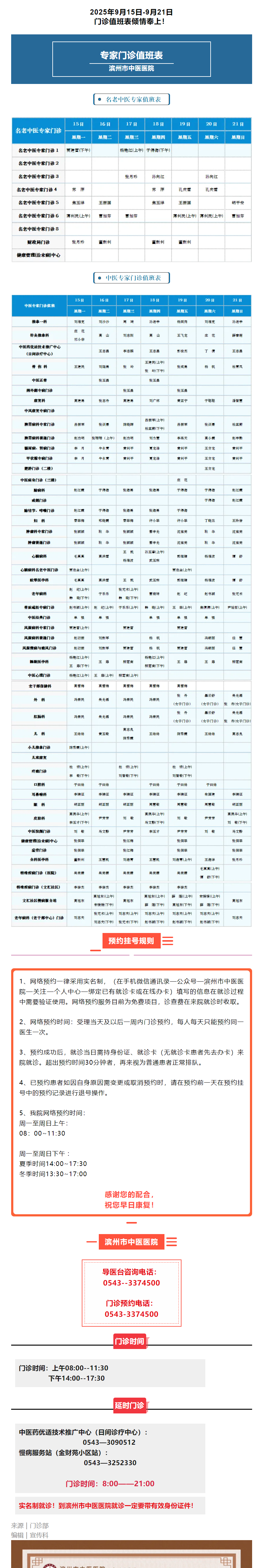 滨州市中医医院(滨州医学院附属中医医院)2025年9月15日-9月21日门诊值班表