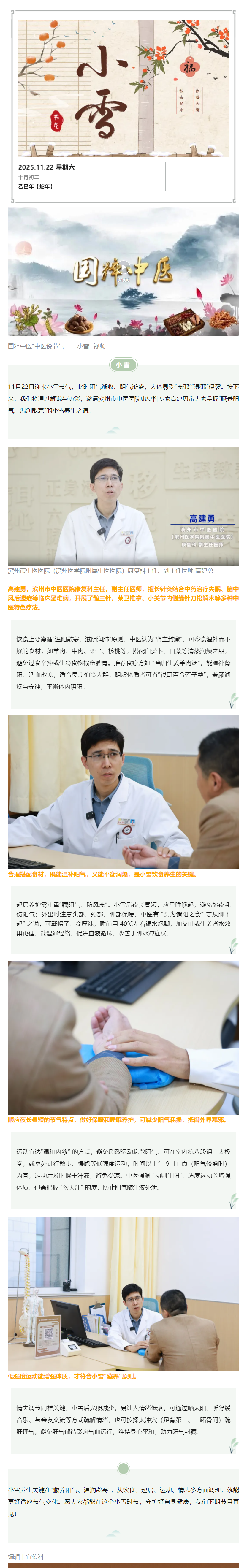 国粹中医·节气养生 | 中医说节气——小雪 滨州市中医医院(滨州医学院附属中医医院)康复科主任、副主任医师 高建勇