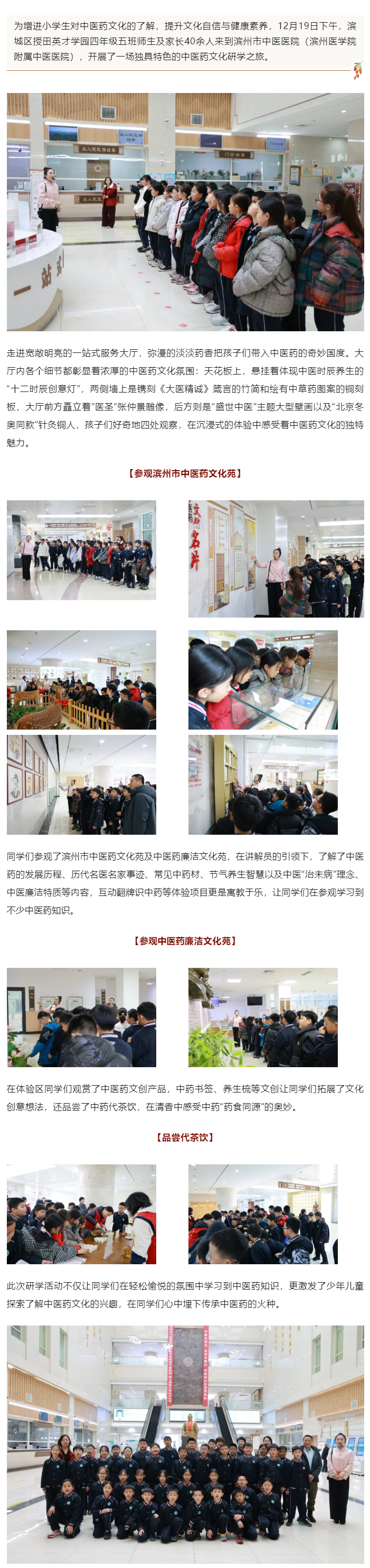 滨城区授田英才学园四年级五班师生及家长来我院参观研学