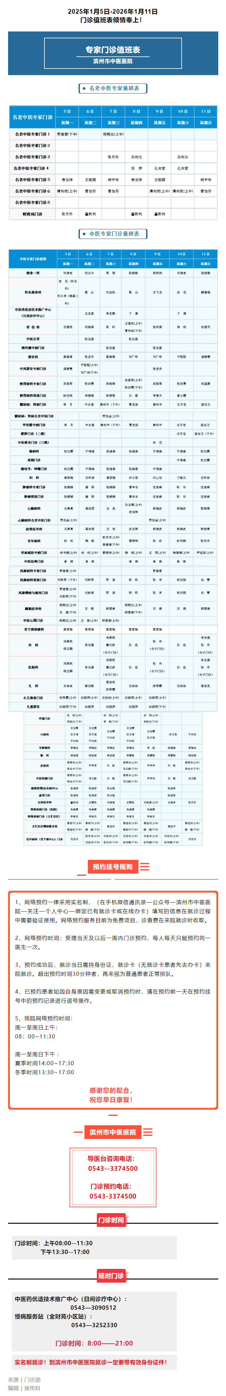 滨州市中医医院(滨州医学院附属中医医院)2025年1月5日-2026年1月11日门诊值班表