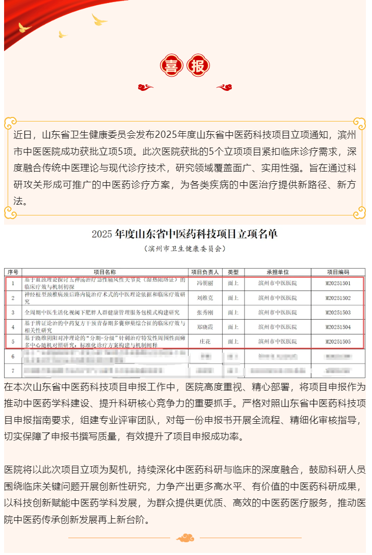 喜报 | 滨州市中医医院5项课题获批省中医药科技项目立项