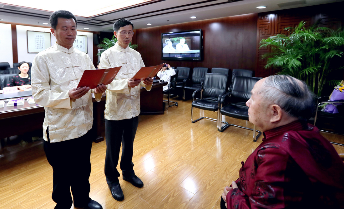 贾在金、吕振军两位专家宣立誓言,表示翁老的学术、为人受人尊敬,提出“活血化瘀十二法”,对预防血管再阻塞、保护心功能和改善心肌组织血液再灌注方面,有明显作用。老师提倡传承与创新并重,提倡在科研中发展中医,形成了自身鲜明的学术特色。他们一定会深入学习翁老的学术思想,努力攀登中医药文化高峰,为推动滨州中医发展,为服务广大滨州市民贡献力量。拜师仪式结束后,两位弟子将开启与翁维良先生的学习之旅。