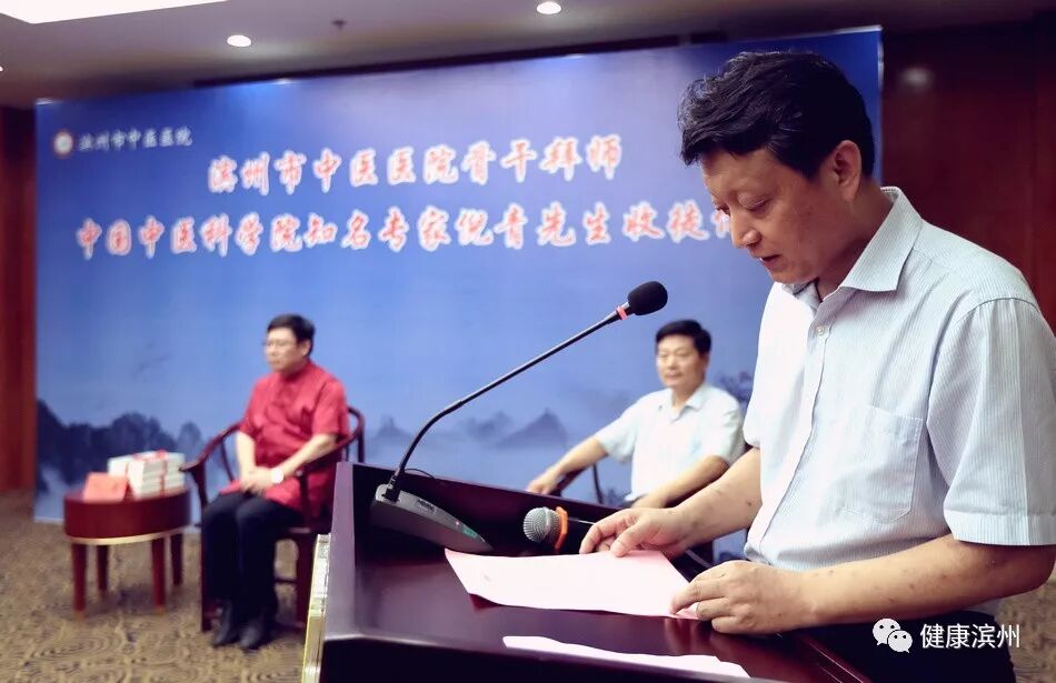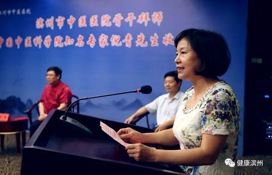 拜师仪式现场,首先,由中国中医科学院中医药发展研究中心常务副主任苏庆民教授同志介绍了倪青老师的情况。滨州市中医医院院长张永生同志介绍了拜师学生秦翠梅、孔雅的基本情况。