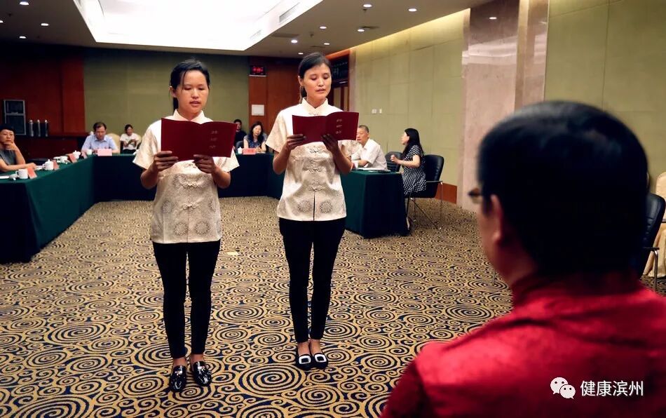 学生身着传统唐装,向拜师老师诵读《拜师贴》,老师读《收徒贴》。随后,弟子向老师奉茶献花。老师回赠经典著作。滨州市卫生计生委党组成员、副调研员方衍勇同志宣读《见证贴》。老师向弟子诫勉训话,弟子听训。学生宣立誓约,表示一定精研国医精粹,刻苦学习,不辜负医院和老师的厚望。