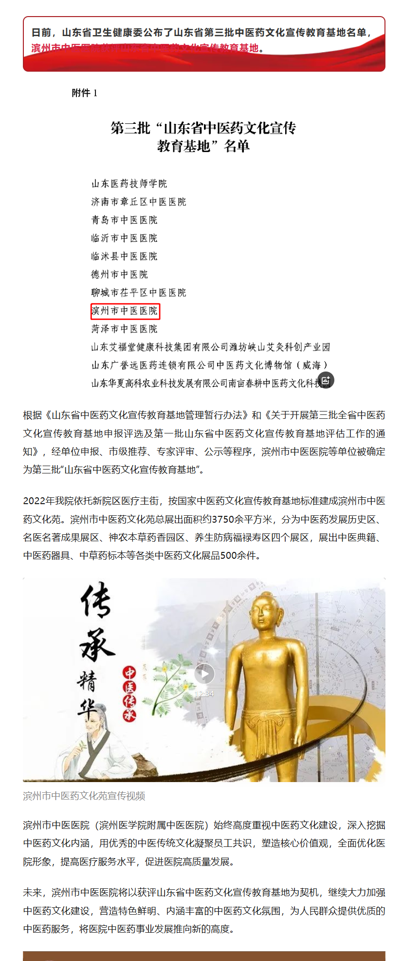 ​喜报 | 滨州市中医医院入选第三批山东省中医药文化宣传教育基地