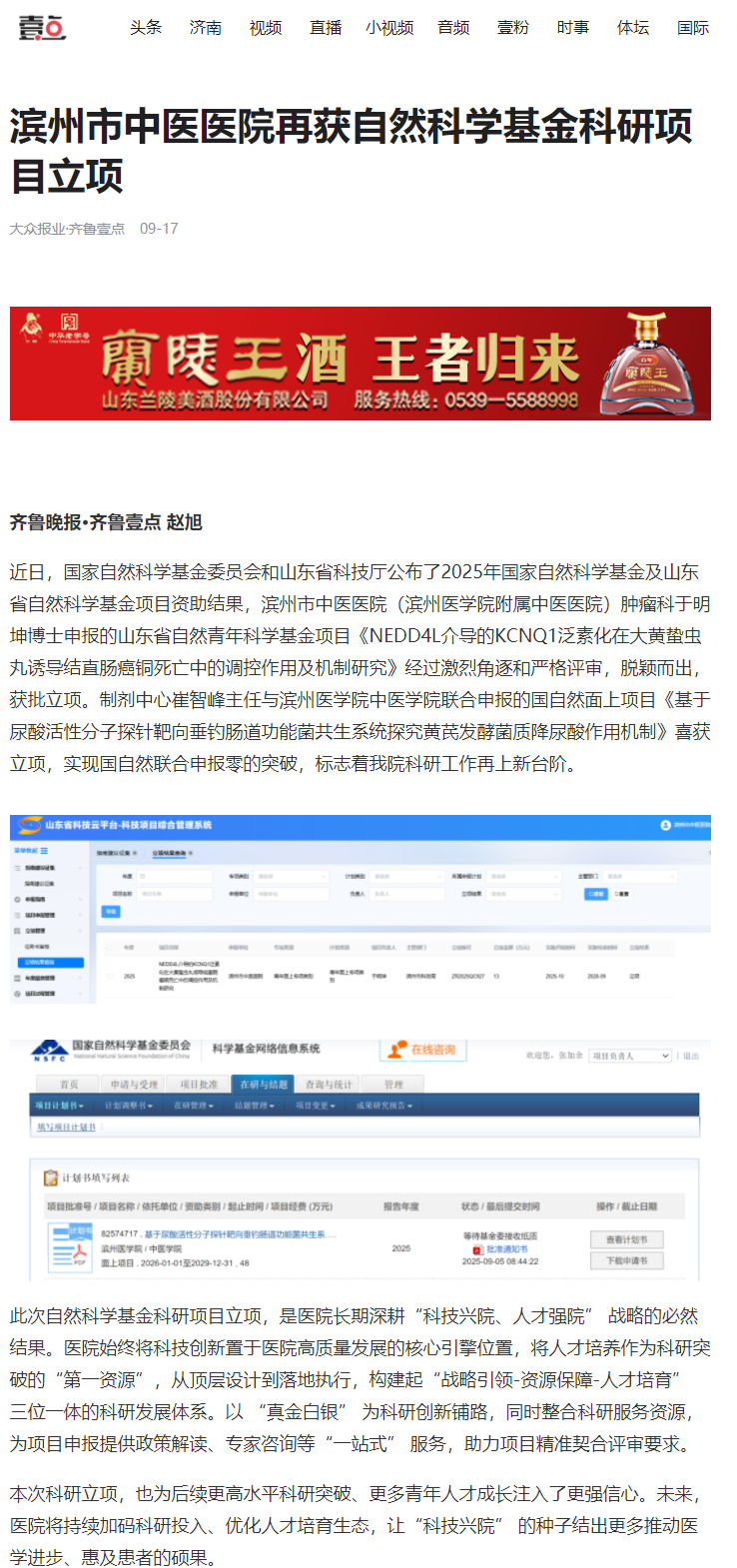 【大众报业·齐鲁壹点】滨州市中医医院再获自然科学基金科研项目立项
