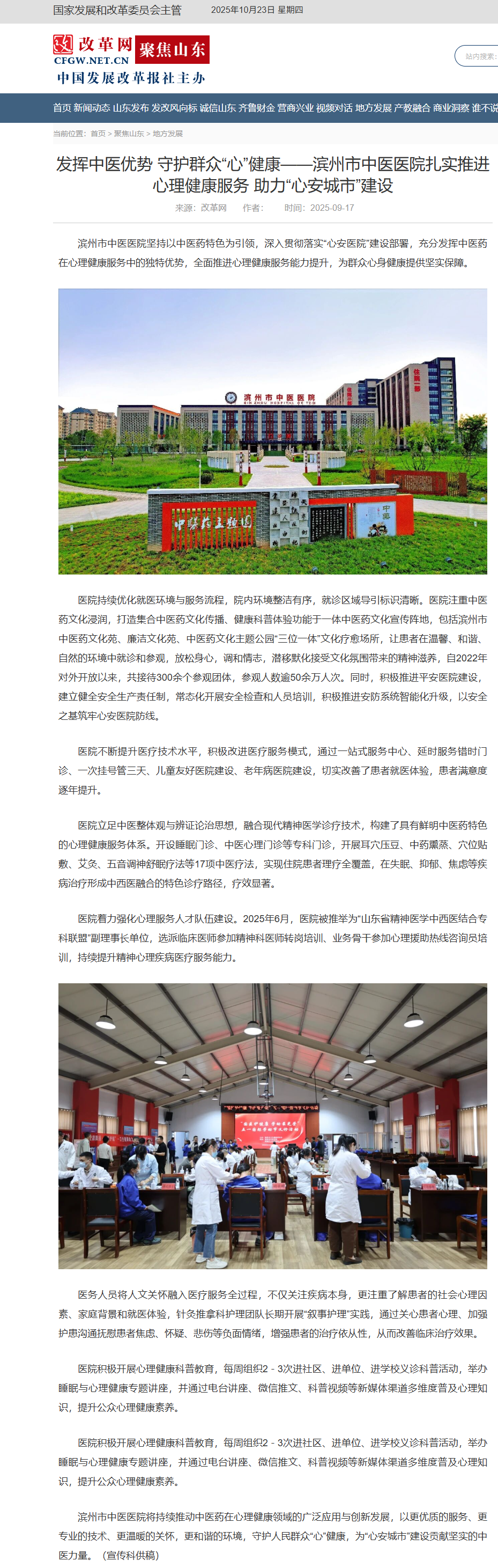 【改革网】发挥中医优势 守护群众“心”健康——滨州市中医医院扎实推进心理健康服务 助力“心安城市”建设