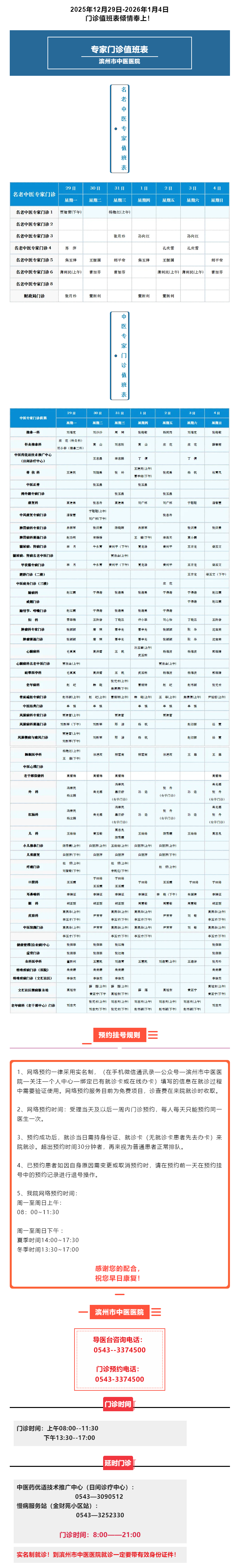 滨州市中医医院(滨州医学院附属中医医院)2025年12月29日-2026年1月4日门诊值班表