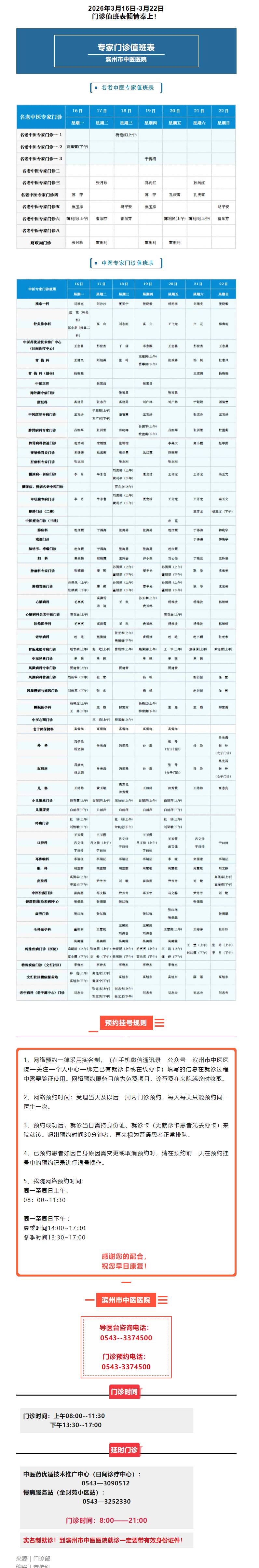 滨州市中医医院(滨州医学院附属中医医院)2026年3月16日-3月22日门诊值班表