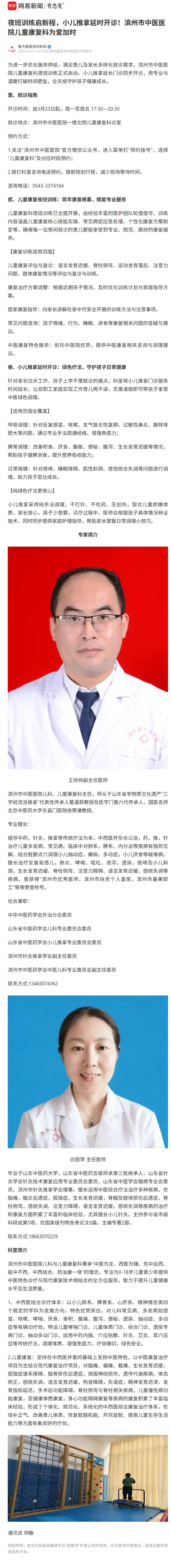 【鲁中晨报滨州新闻网易号】夜班训练启新程,小儿推拿延时开诊!滨州市中医医院儿童康复科为爱加时