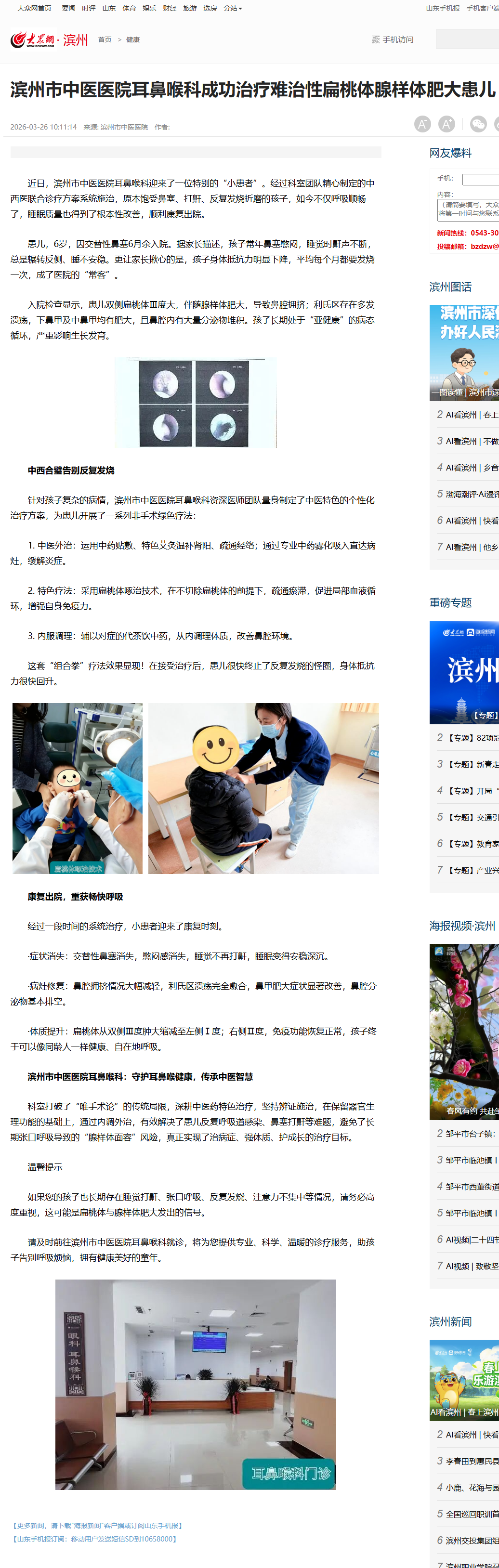 【大众网】滨州市中医医院耳鼻喉科成功治疗难治性扁桃体腺样体肥大患儿
