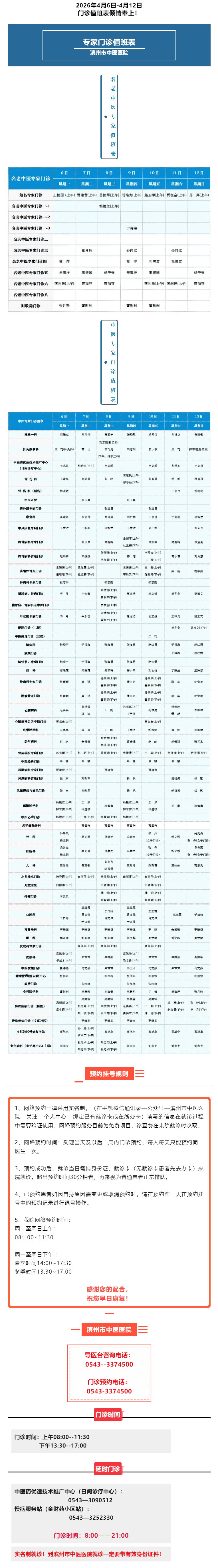 滨州市中医医院2026年4月6日-4月12日门诊值班表