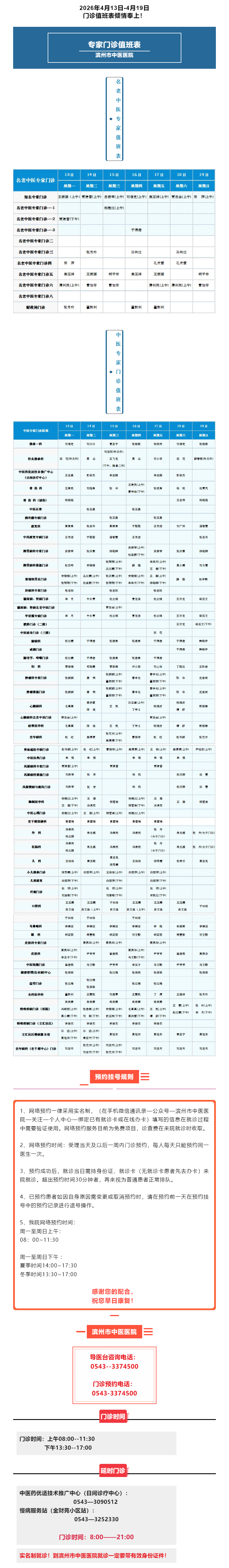 滨州市中医医院2026年4月13日-4月19日门诊值班表