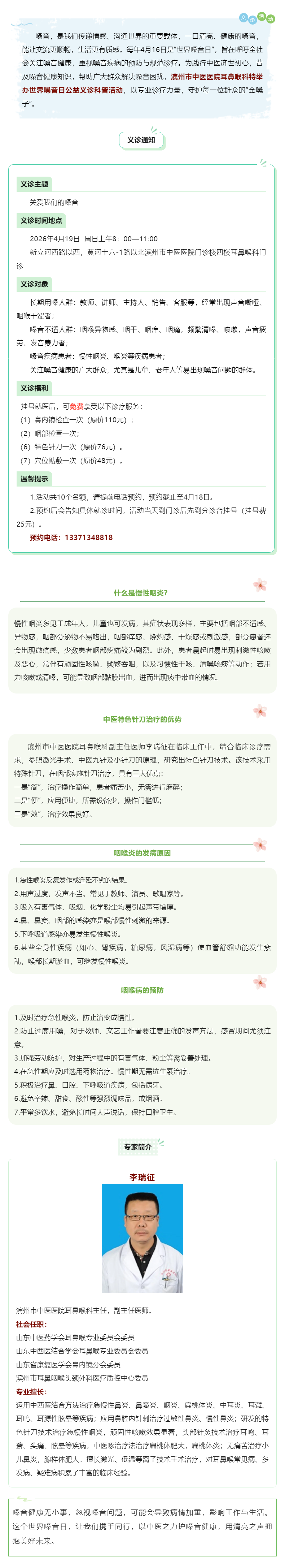 关爱我们的嗓音——滨州市中医医院世界嗓音日义诊科普活动4月19日周日上午暖心上线
